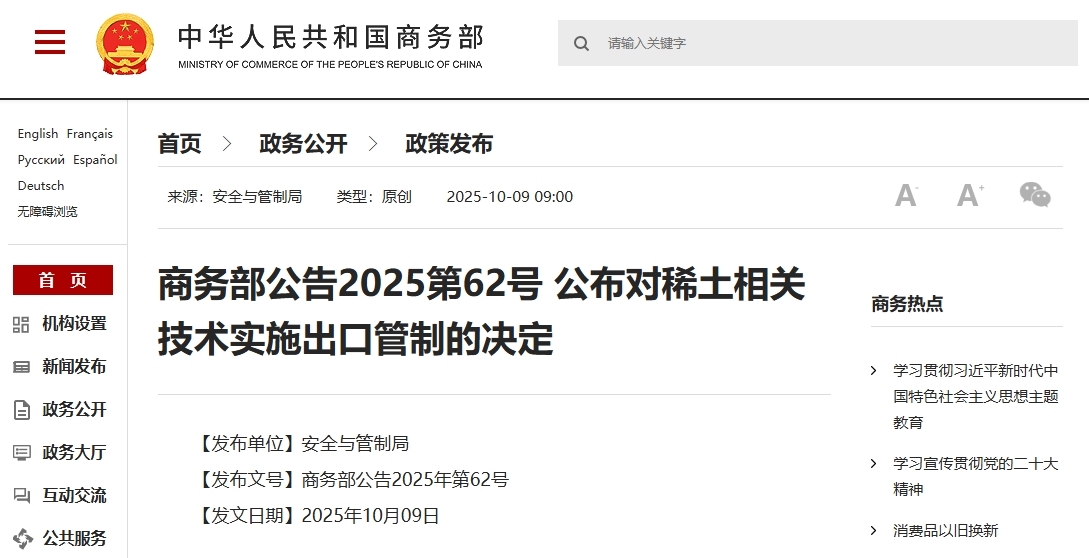 10月9日,商務(wù)部發(fā)布2025年第62號(hào)公告,決定對(duì)稀土相關(guān)技術(shù)實(shí)施出口管制。
