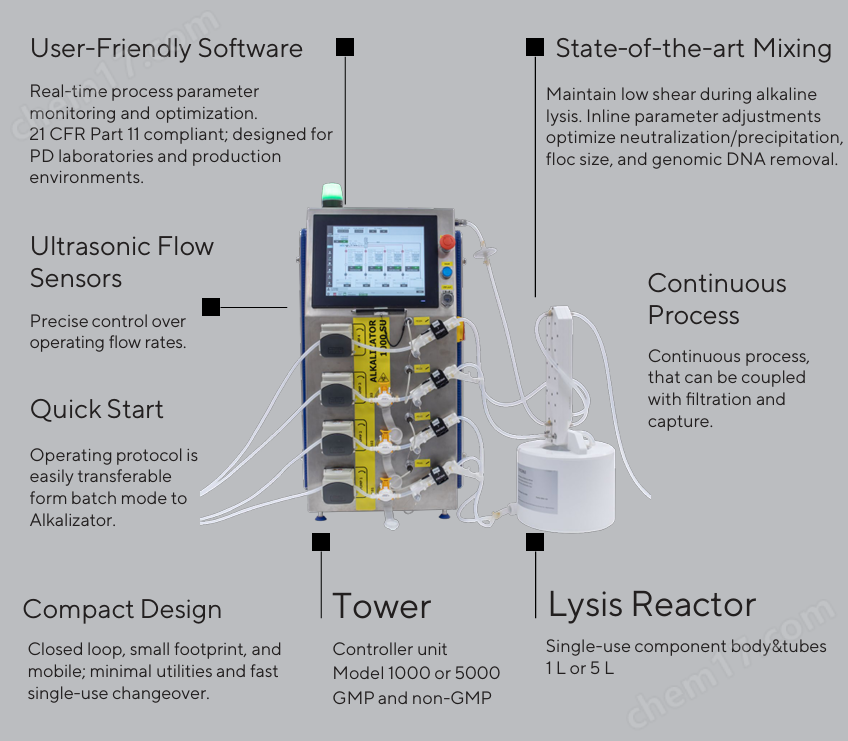 - Alkalizator是一款全自動(dòng)在線裂解系統(tǒng),專為高效提取質(zhì)粒DNA而設(shè)計(jì)。該系統(tǒng)可 控制堿性裂解過程,從而實(shí)現(xiàn)更高效率和更優(yōu)品質(zhì)的質(zhì)粒DNA。
