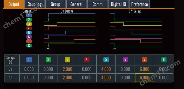 每個輸出的開啟/關閉延遲功能使您可以對輸出的開啟/關閉進行序列化設置。