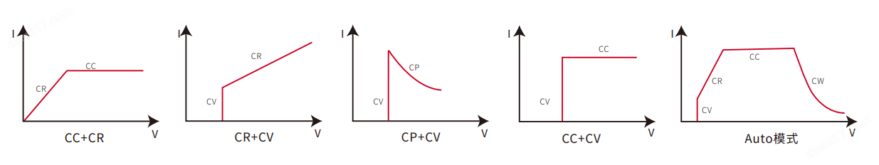 IT2700負載具備10種工作模式,除了基礎模式CC、CV、CR、CP,還具備5種復合工作模式:CC+CR模式常用于車載充電機限壓、限流特性測試、恒壓精度、恒流精度的測試中,防止車載充電機的過流保護。CR+CV模式應用于模擬LED燈,測試LED源的場合,并測得LED電流紋波參數(shù)。CP+CV模式可取代VON點的設定應用或用于電池的放電測試,電壓設置點可作為截止電壓。CC+CV功能可用于負載模擬電池,測試充電樁或車載充電器的場合,CV工作的同時,限制拉載最大電流。AUTO模式可在定電壓,定電阻,定電流模式與定功率模式的限制下進行自動切換。當待測物保護線路損壞時,可通過自動切換機制來避免待測物損壞。