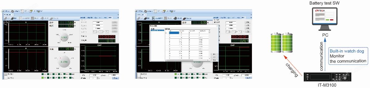 IT-M3100系列具有電池充電功能,可對電池進行充電測試。用戶通過面板就可自行設置電池四種測試關斷條件:關斷電壓、關斷電流、關斷容量和充電時間。當四者中任意一種條件滿足時,即會自動中斷測試。測試過程中可觀測電池的電壓、充電時間和已充電容量。同時,IT9000上位機軟件配置看門狗功能,為用戶提供可靠的自動化測試方案。