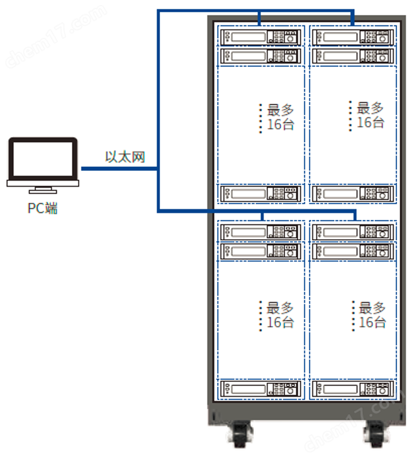 IT-M3100系列具備獨立多通道的設計架構, 16臺IT-M3100組成多通道電源系統(tǒng)后,每臺儀器界面會顯示通道號。將其中一臺電源的通訊接口與PC 端連接,可在上位機軟件中獨立控制系統(tǒng)中的每臺電源,每個通道可獨立操作。IT-M3100系列可達16*16通道,1個37U機柜內就可達64通道,透過并聯功能可支持多種不同功率的待測物測試,并且使用戶的使用更為彈性,設備的使用率大幅提高。