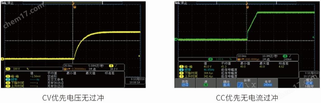 允許用自行設定電源ON時的輸出模式,防止電源輸出ON時的過沖。選擇CV優(yōu)先模式,電源優(yōu)先高速建立電壓的同時抑制電壓過沖的產生。選擇CC優(yōu)先模式,電源優(yōu)先高速建立電流的同時抑制電流過沖的產生。