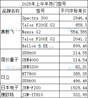 據(jù)化工儀器網(wǎng)不完全統(tǒng)計(jì),上半年賽默飛電鏡的熱門型號(hào)有Spectra 300、Talos F200X G2、Nexsa G2、Talos F200X G2、Helios 5 UX等,平均中標(biāo)單價(jià)分別為2946.4萬(wàn)元/套、858.3萬(wàn)元/套、554.365萬(wàn)元/套、2041.2萬(wàn)元/套、899.46萬(wàn)元/套;日立電鏡的熱門型號(hào)有HT7800、SU8600等,平均中標(biāo)單價(jià)為385.35萬(wàn)元/套、496.46萬(wàn)元/套;日本電子的熱門型號(hào)有JEM-F200,平均中標(biāo)單價(jià)為1529.44萬(wàn)元;捷歐陸的熱門型號(hào)有JSM-IT810,平均中標(biāo)單價(jià)為332.95。