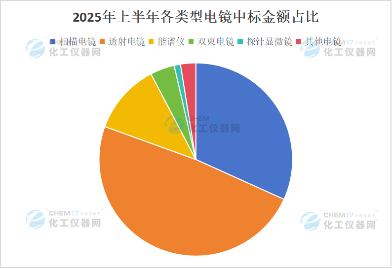 排除未知品牌,2025年上半年電鏡的中標(biāo)類型有4種,分別為透射電鏡、能譜儀、雙束電鏡、探針顯微鏡。“各類型電鏡中標(biāo)金額占比”主要展示了中標(biāo)金額各類型電鏡的中標(biāo)金額占比,其余歸為其他品牌。