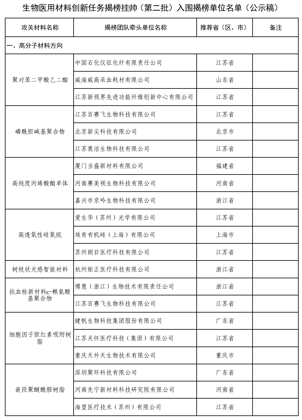 生物醫(yī)用材料創(chuàng)新任務(wù)揭榜掛帥(第二批)入圍揭榜單位公布