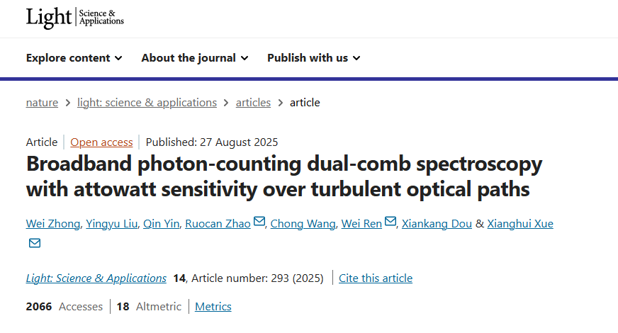 中國科學(xué)技術(shù)大學(xué)薛向輝教授團(tuán)隊在單光子雙光梳光譜領(lǐng)域取得重要進(jìn)展,提出雙光梳探測新方法并在開放大氣光譜探測中實(shí)現(xiàn)應(yīng)用突破。該項(xiàng)研究成果于8月27日在線發(fā)表于國際學(xué)術(shù)期刊《Light: Science & Applications》。