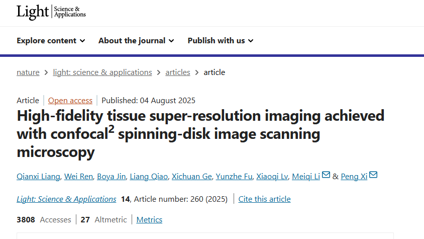 超分辨顯微成像技術近年來顯著推動了生命科學領域對微觀結構的高精度觀測,然而在深層組織中,散射干擾與成像保真度下降等問題仍制約其進一步發(fā)展。針對這一挑戰(zhàn),北京大學席鵬教授團隊提出了一種稱為“雙重共聚焦轉盤圖像掃描顯微技術”(Confocal² Spinning-Disk Image Scanning Microscopy,C²SD-ISM)的新型成像方法,實現(xiàn)了在180 μm深度下的高保真三維超分辨成像。該成果已于近日發(fā)表在《Light: Science & Applications》。