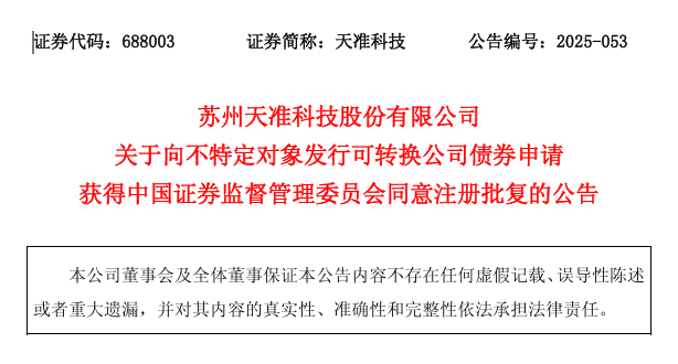 近日,蘇州天準科技股份有限公司(證券代碼:688003,證券簡稱:天準科技)發(fā)布公告披露,公司已收到中國證券監(jiān)督管理委員會出具的《關于同意蘇州天準科技股份有限公司向不特定對象發(fā)行可轉換公司債券注冊的批復》(證監(jiān)許可〔2025〕2266號)。這一文件的落地,標志著天準科技本次可轉債發(fā)行正式獲得監(jiān)管層注冊核準,公司后續(xù)將按既定計劃推進相關發(fā)行工作。