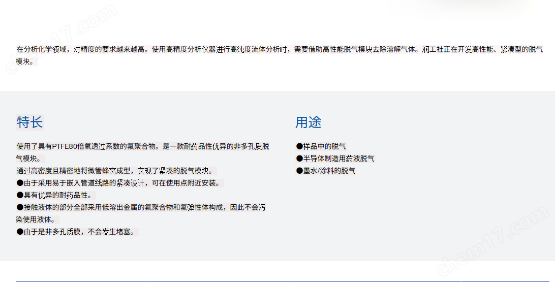 使用具有PTFE 80倍酸透過系數(shù)的氟聚合物,這種非多孔質(zhì)的脫氣模塊耐藥品性能好。
